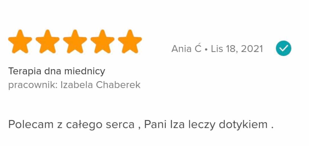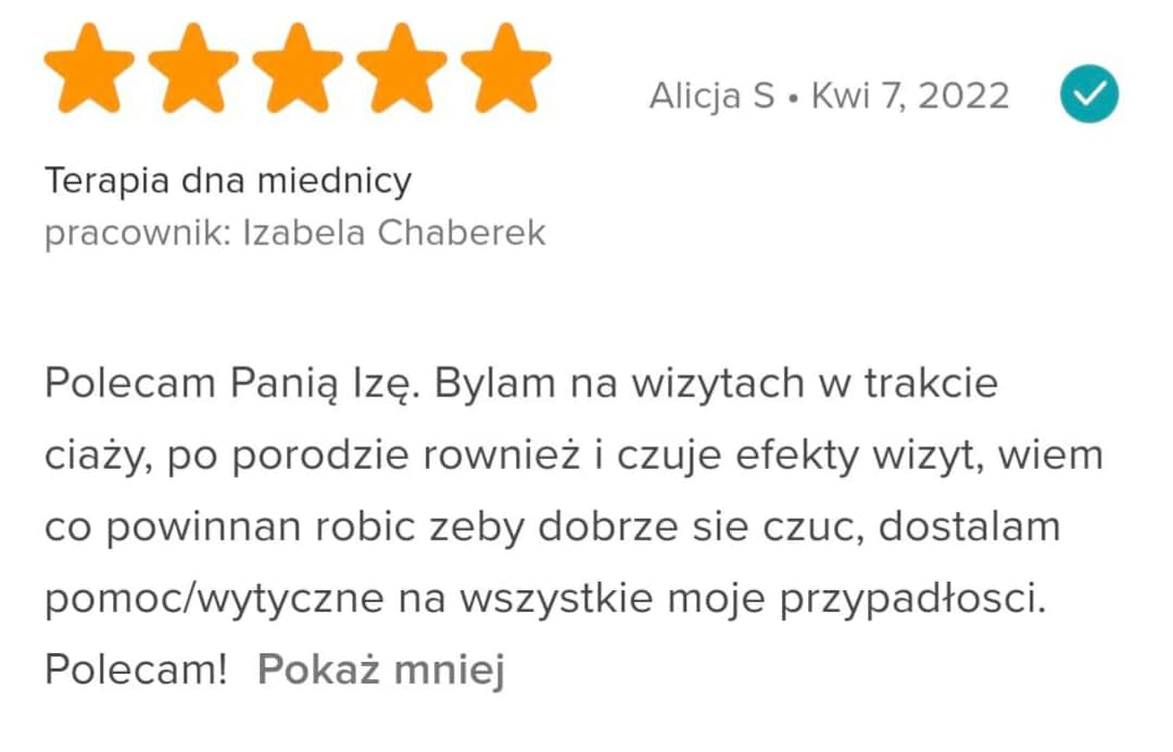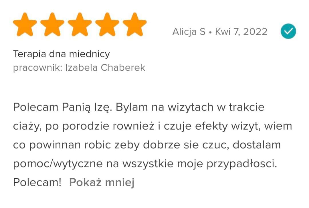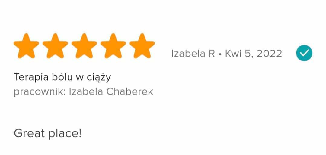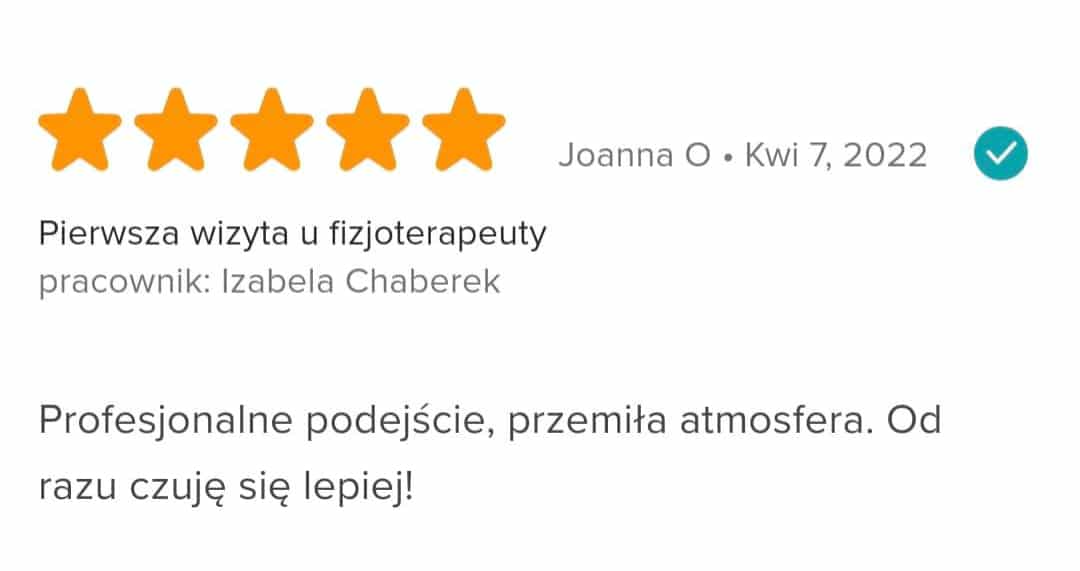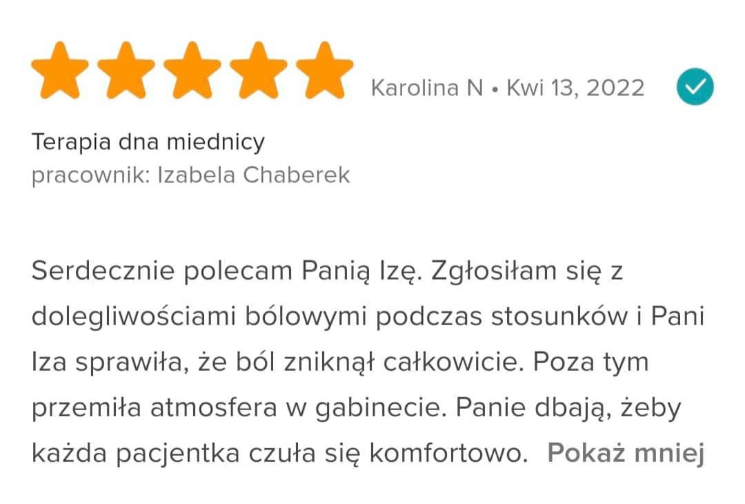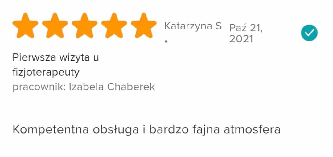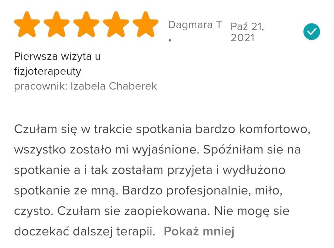 Polecam p. Izabelę Szyszko-Chaberek. Wizyty odbywały się w miłej atmosferze. Pani Iza rzetelnie podchodzi do pacjenta, wyjaśnia wszystkie wątpliwości, a co najważniejsze, jest skuteczna w tym co robi. Efekty widoczne od razu.