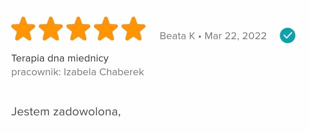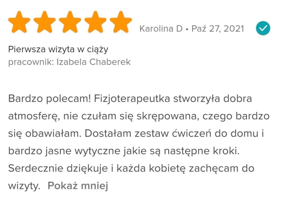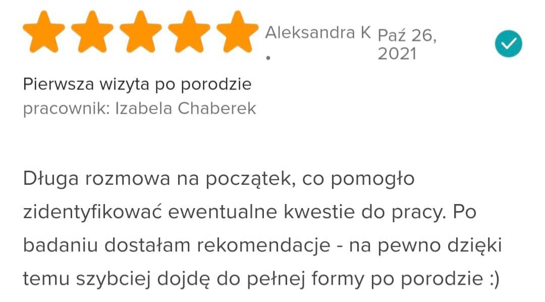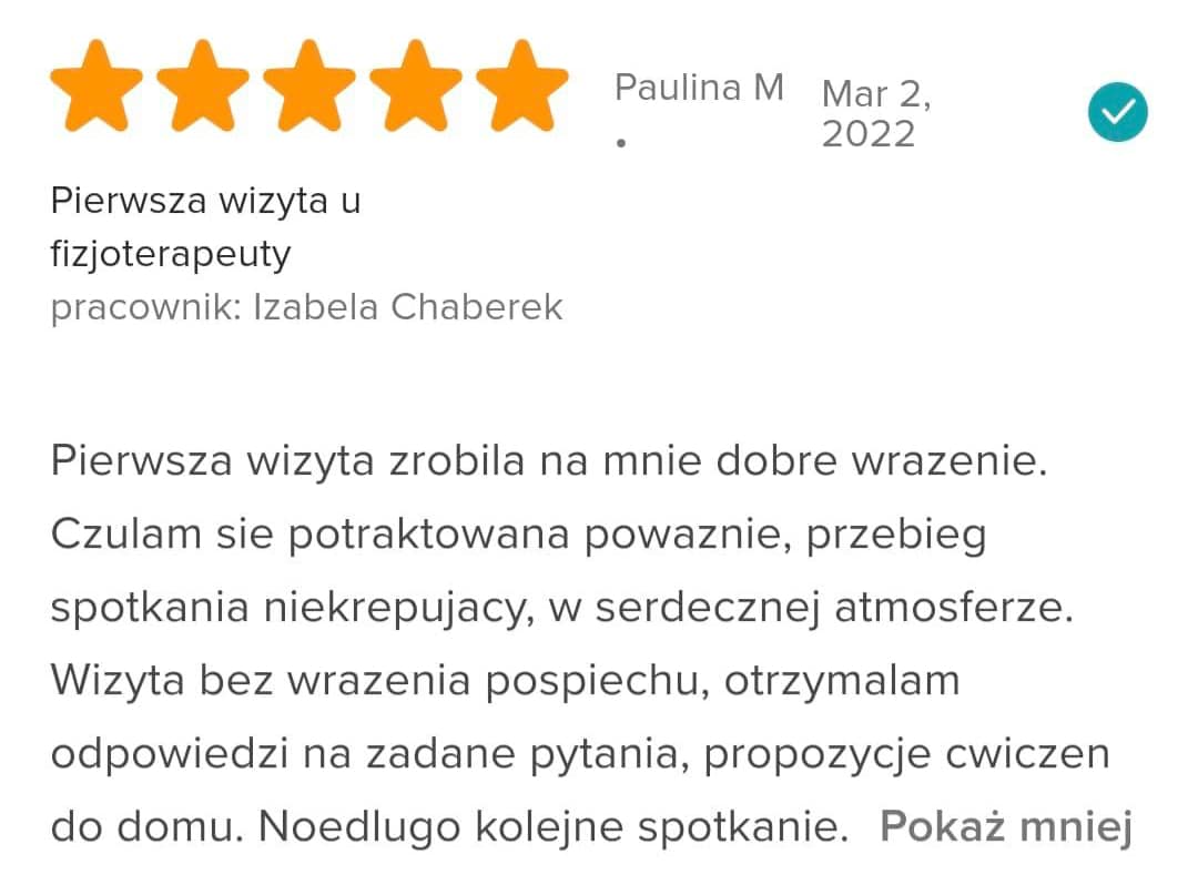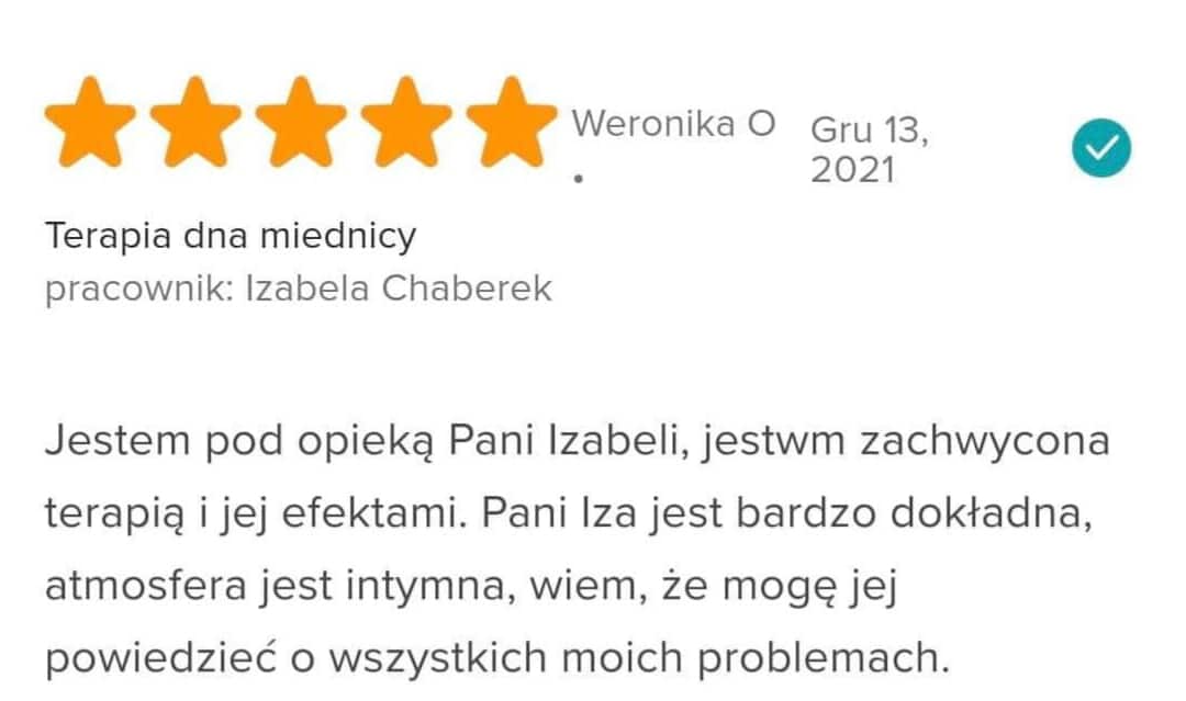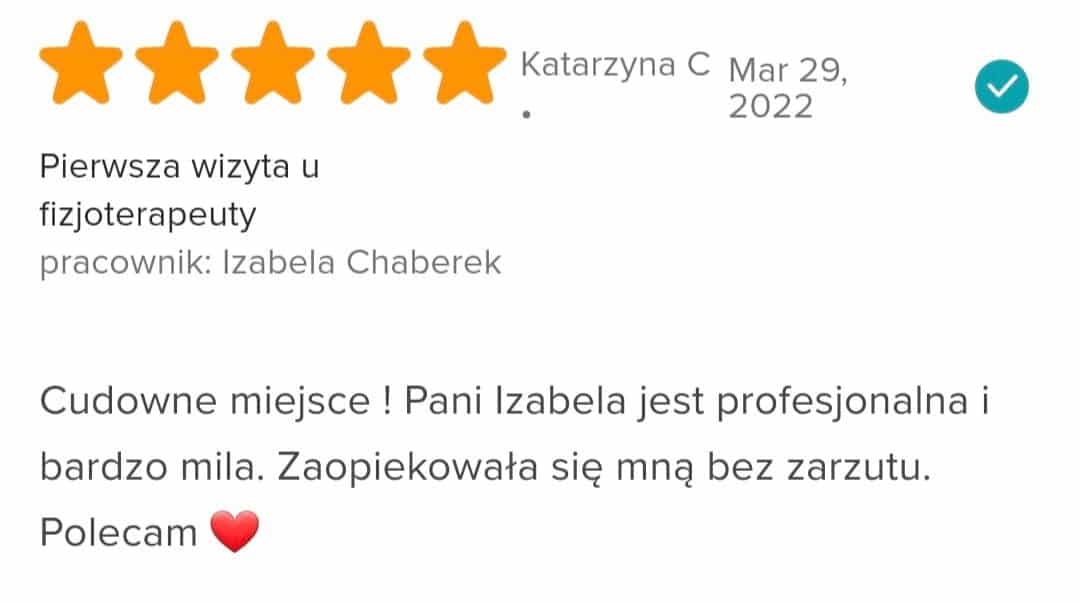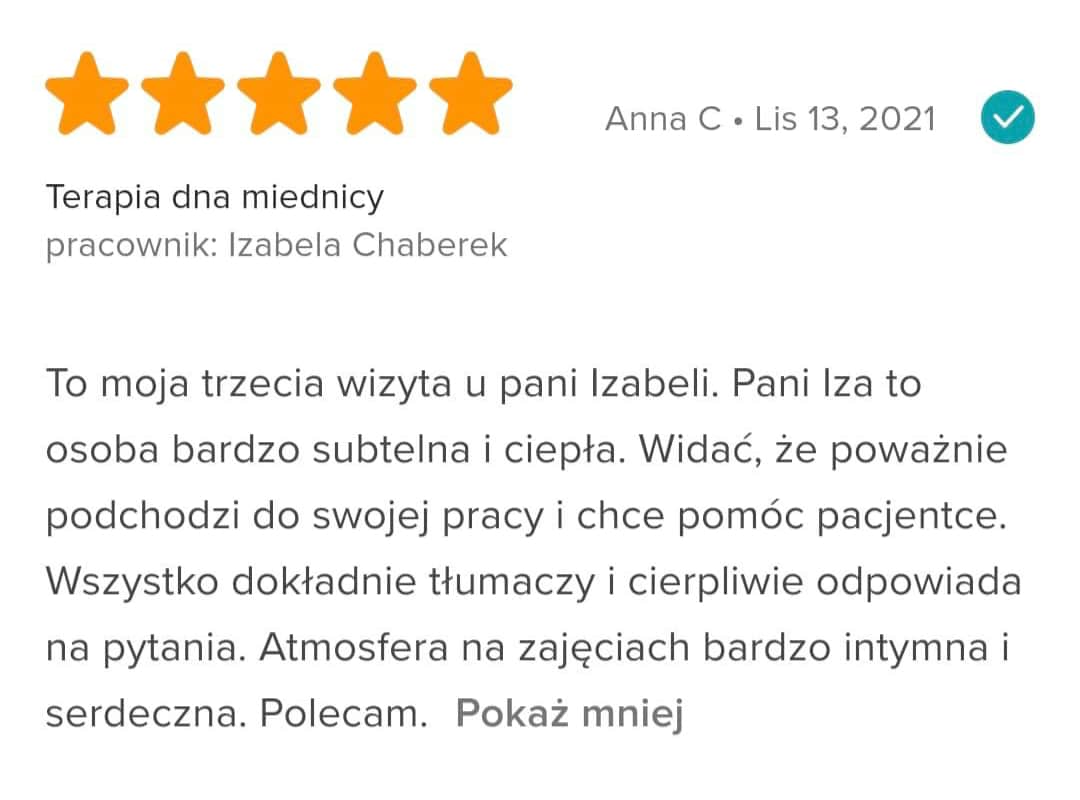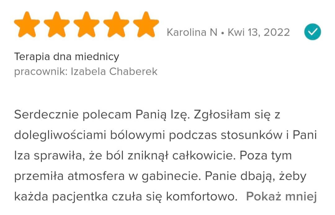 Polecam p. Izabelę Szyszko-Chaberek. Wizyty odbywały się w miłej atmosferze. Pani Iza rzetelnie podchodzi do pacjenta, wyjaśnia wszystkie wątpliwości, a co najważniejsze, jest skuteczna w tym co robi. Efekty widoczne od razu.
